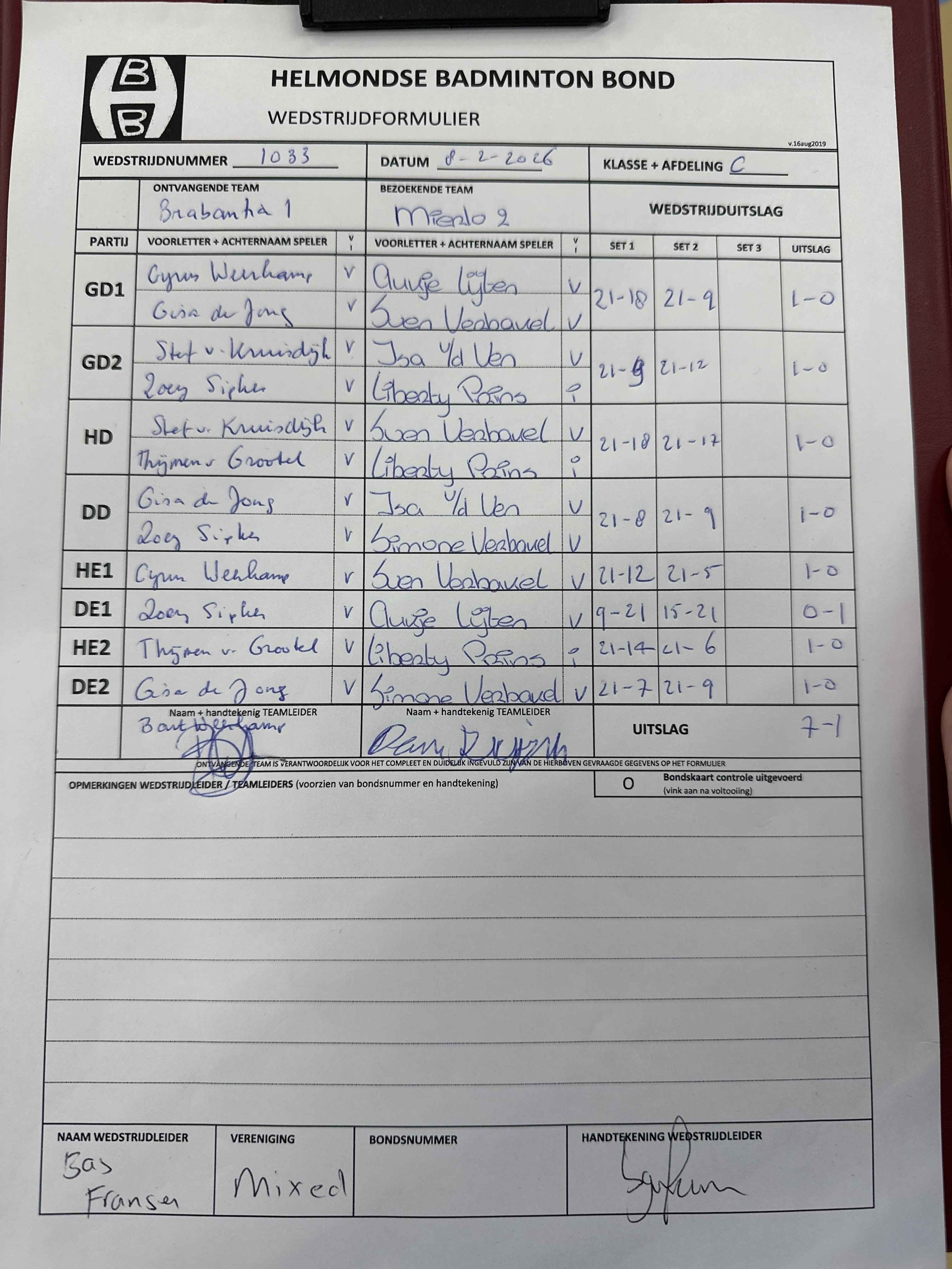 | 09:30 | zo 08-02-2026 | Brabantia 1 | - | Mierlo 2 | 11 | 7 - 1 | ||