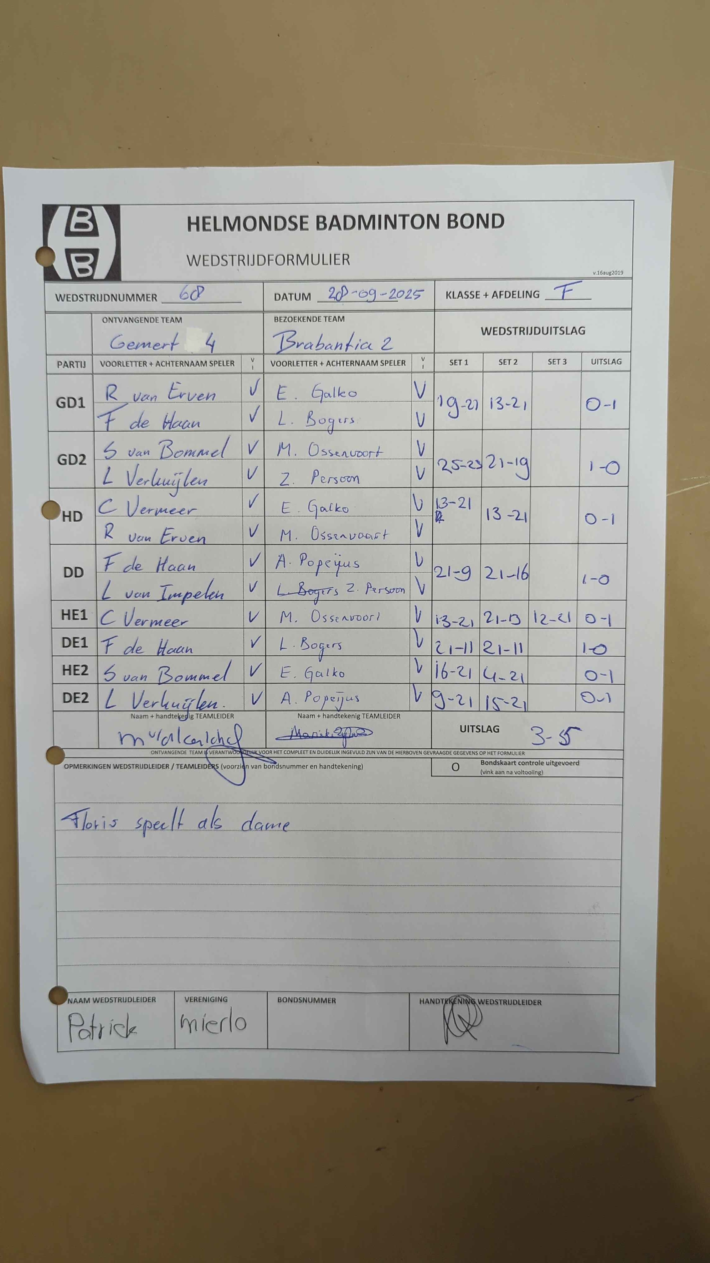 | 09:30 | zo 28-09-2025 | Gemert 4 | - | Brabantia 2 | 15 | 3 - 5 | ||