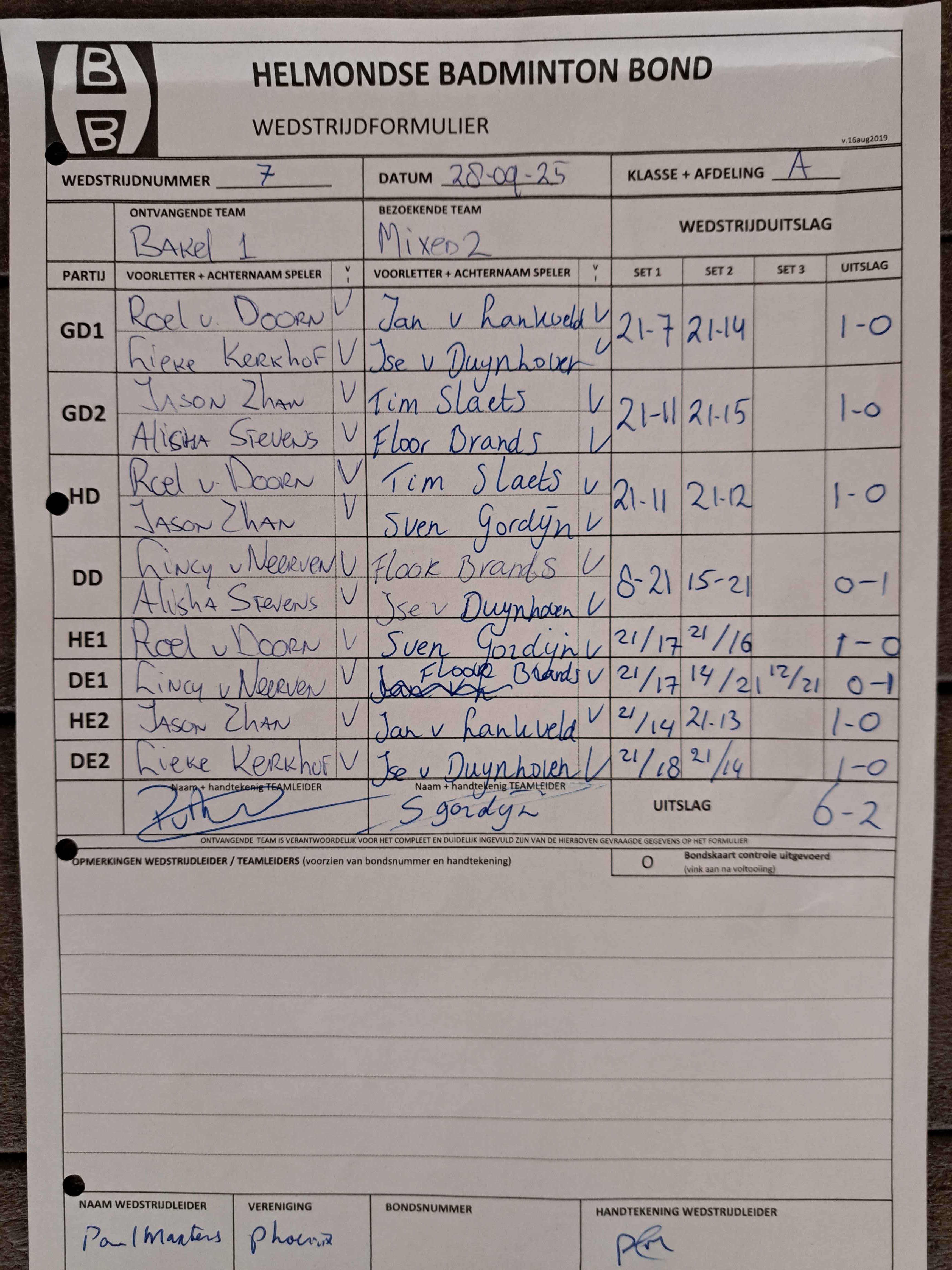 | 12:30 | zo 28-09-2025 | Bakel 1 | - | Mixed 2 | 1 | 6 - 2 | ||