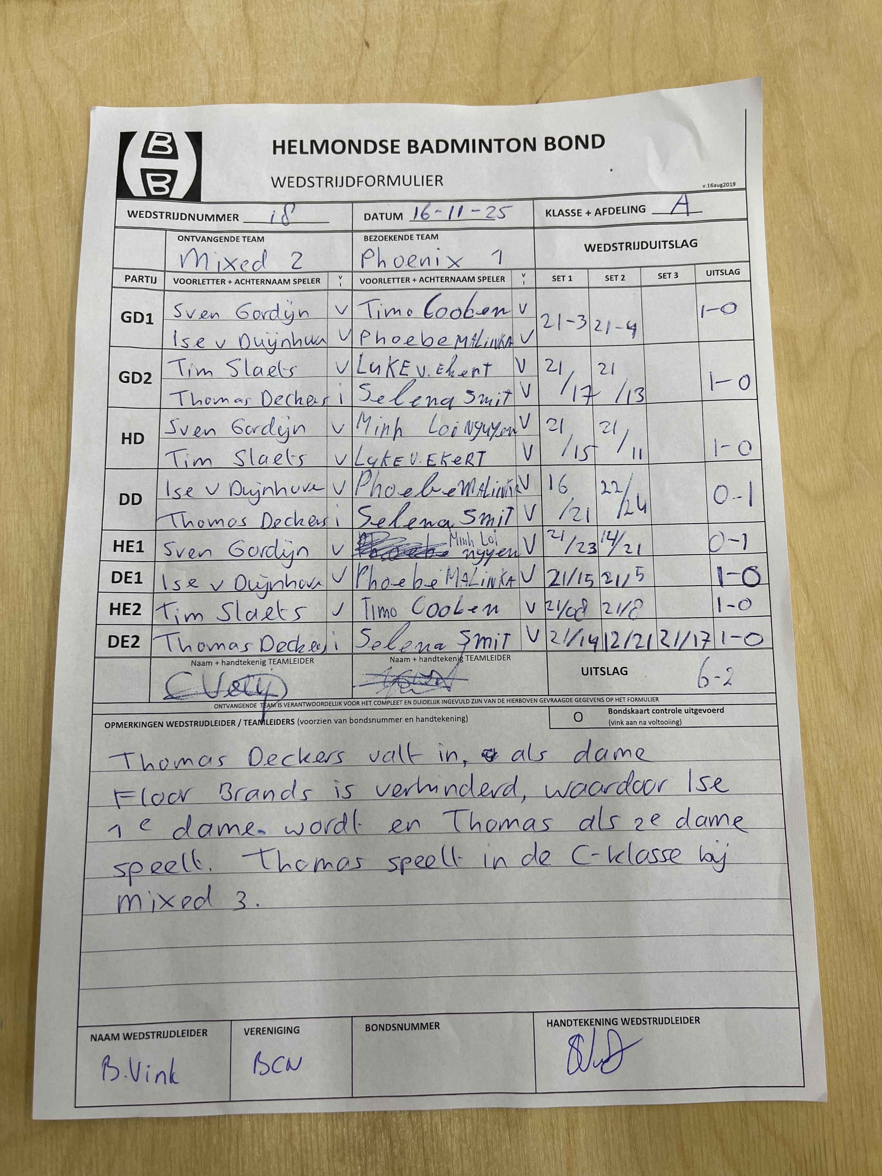 | 12:30 | zo 16-11-2025 | Mixed 2 | - | Phoenix 1 | 3 | 6 - 2 | ||