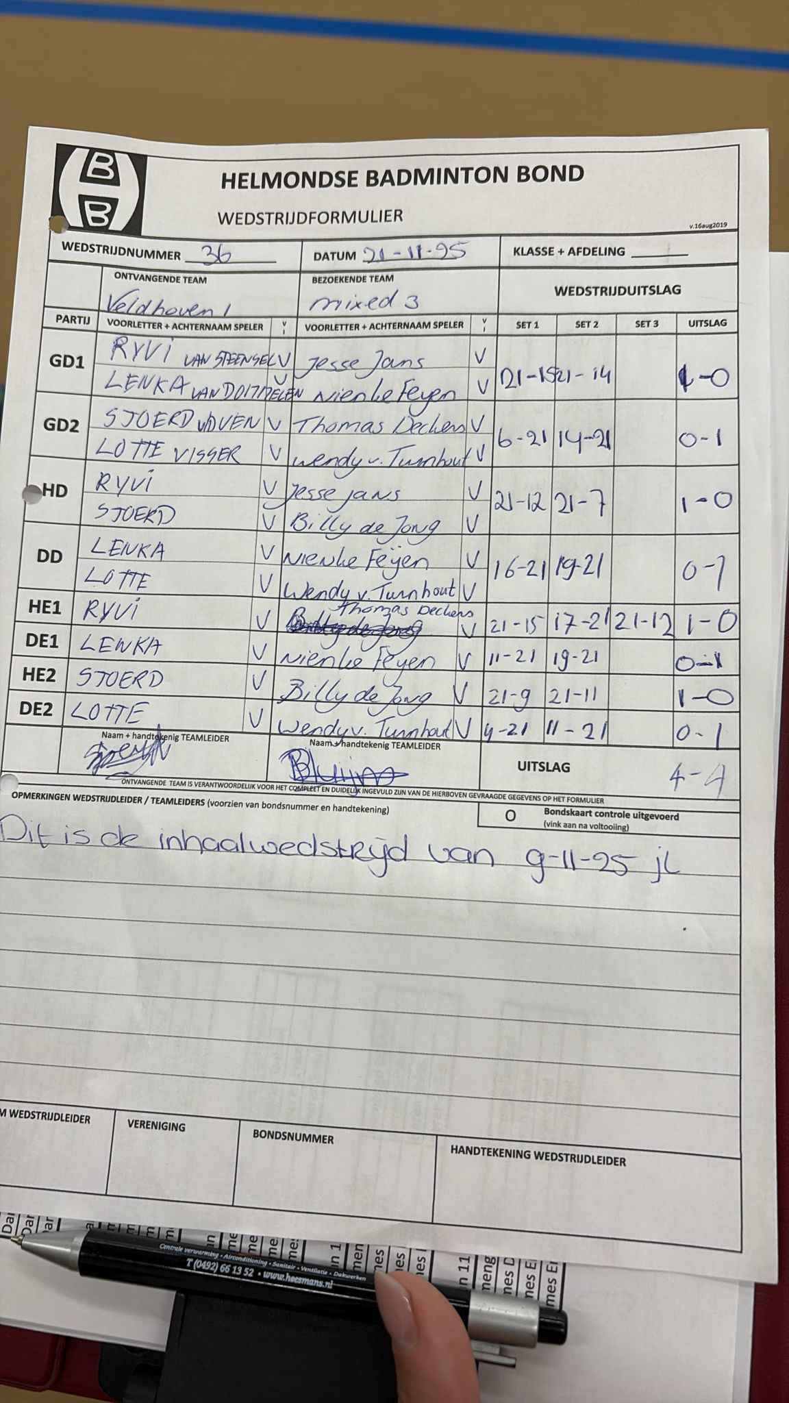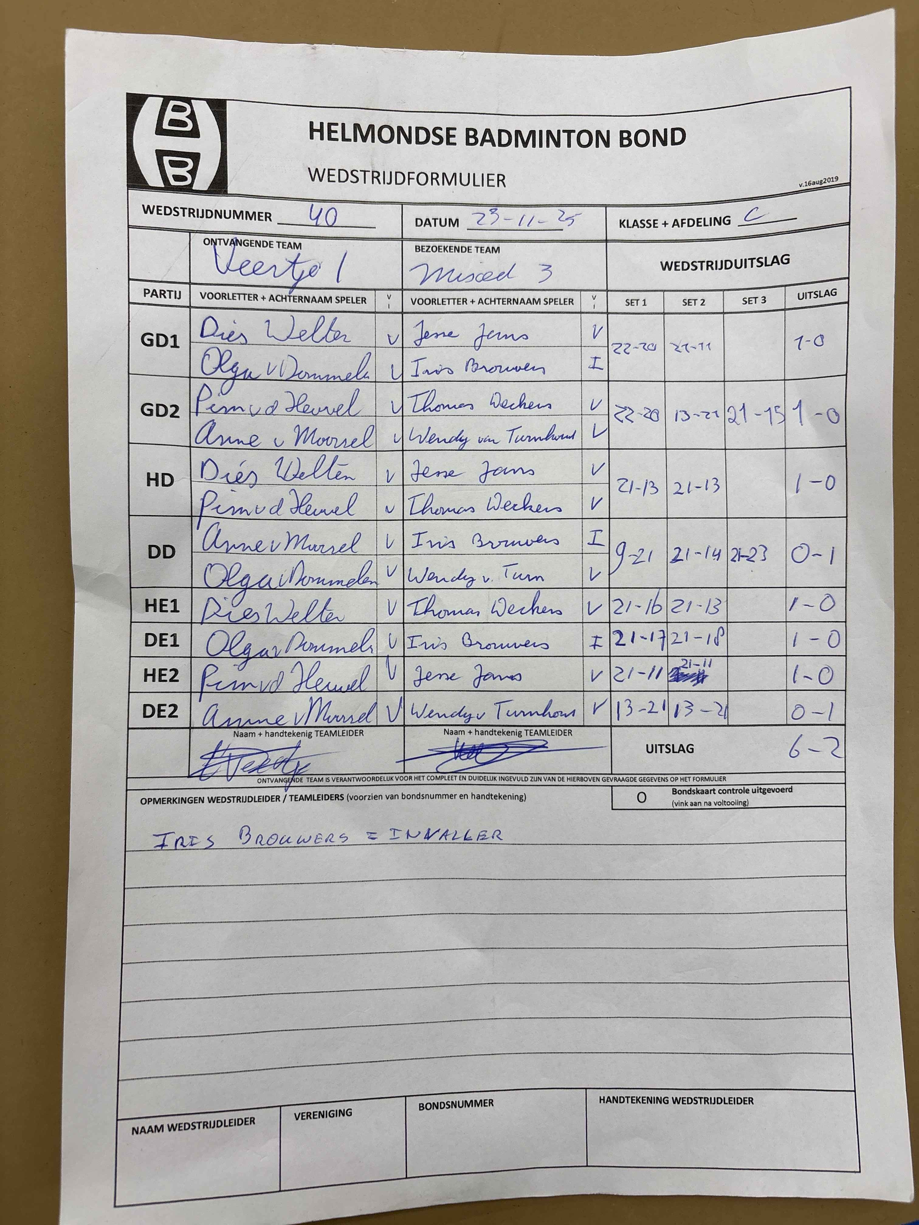 | 12:30 | zo 09-11-2025 | Veldhoven 1 | - | Mixed 3 | 2 | 4 - 4 | ||