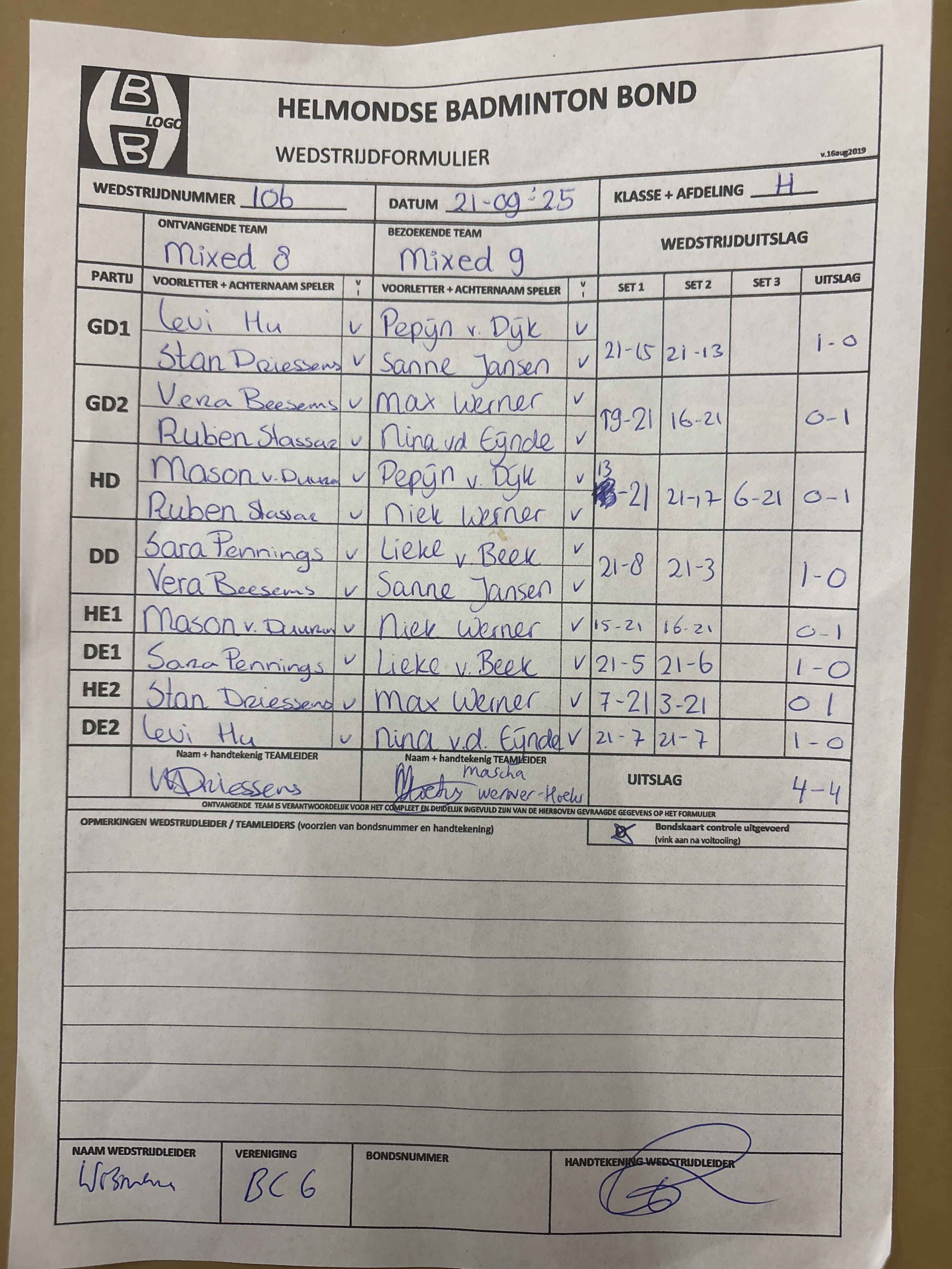 | 09:30 | zo 21-09-2025 | Mixed 8 | - | Mixed 9 | 5 | 4 - 4 | ||