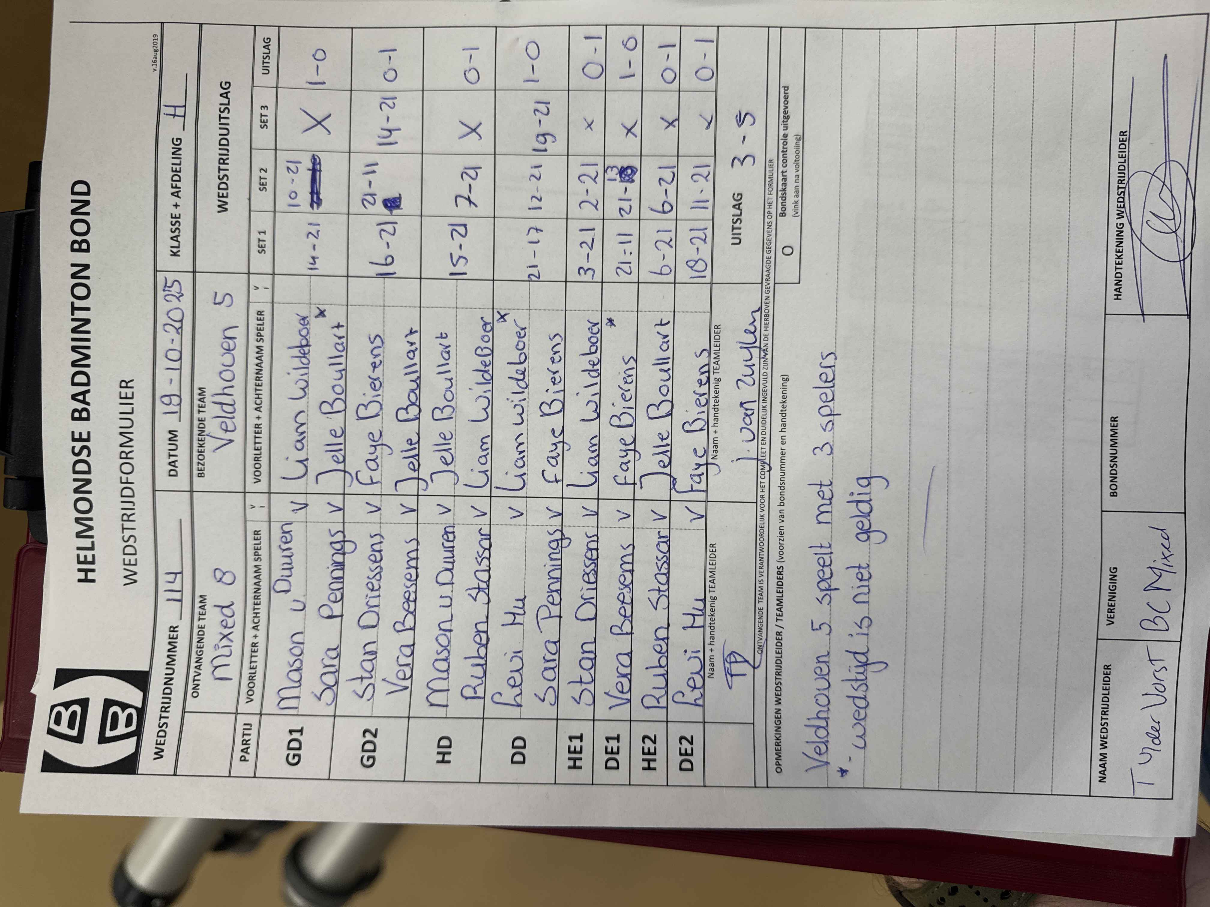 | 09:30 | zo 19-10-2025 | Mixed 8 | - | Veldhoven 5 | 2 | 3 - 5 | ||