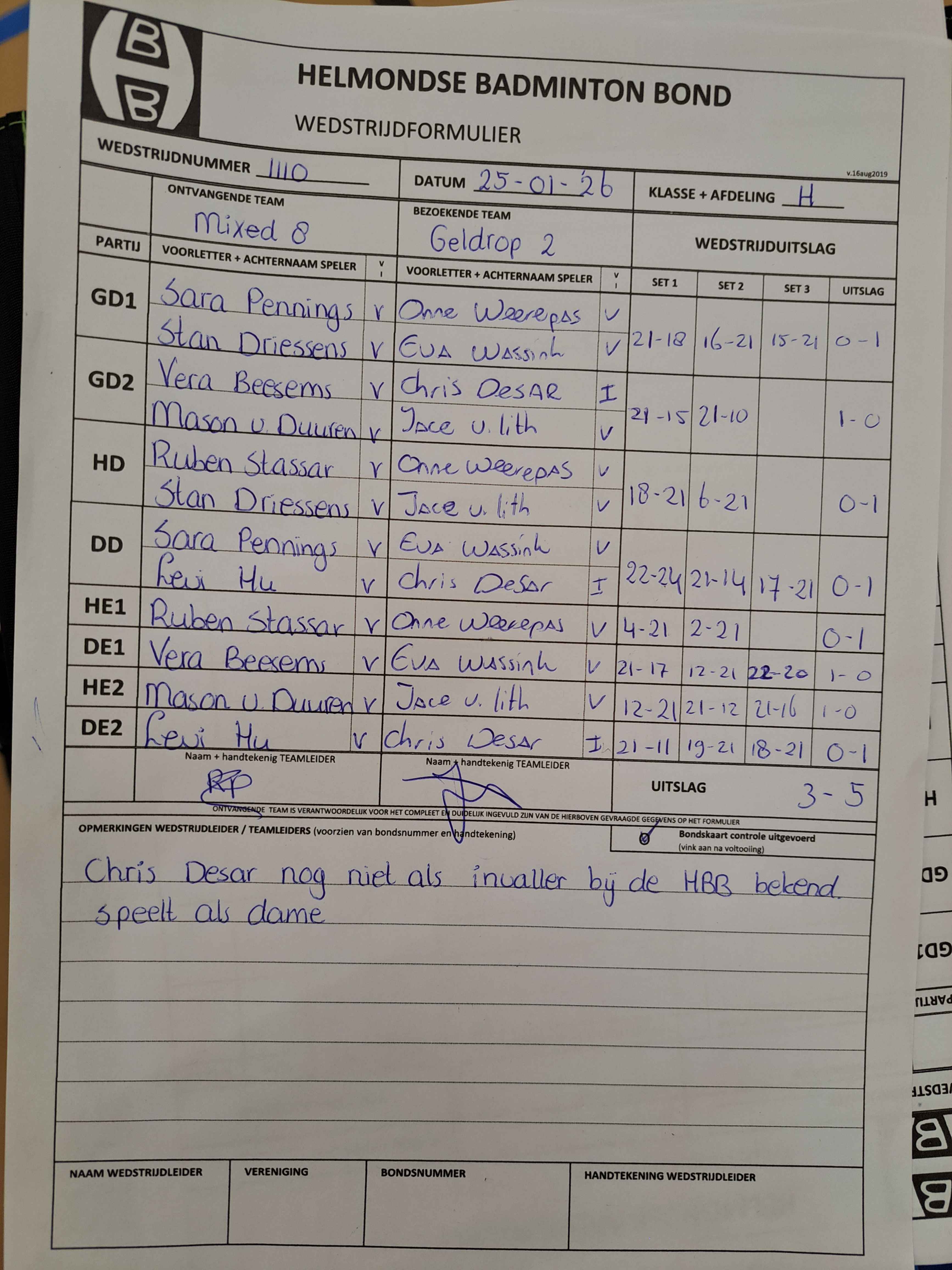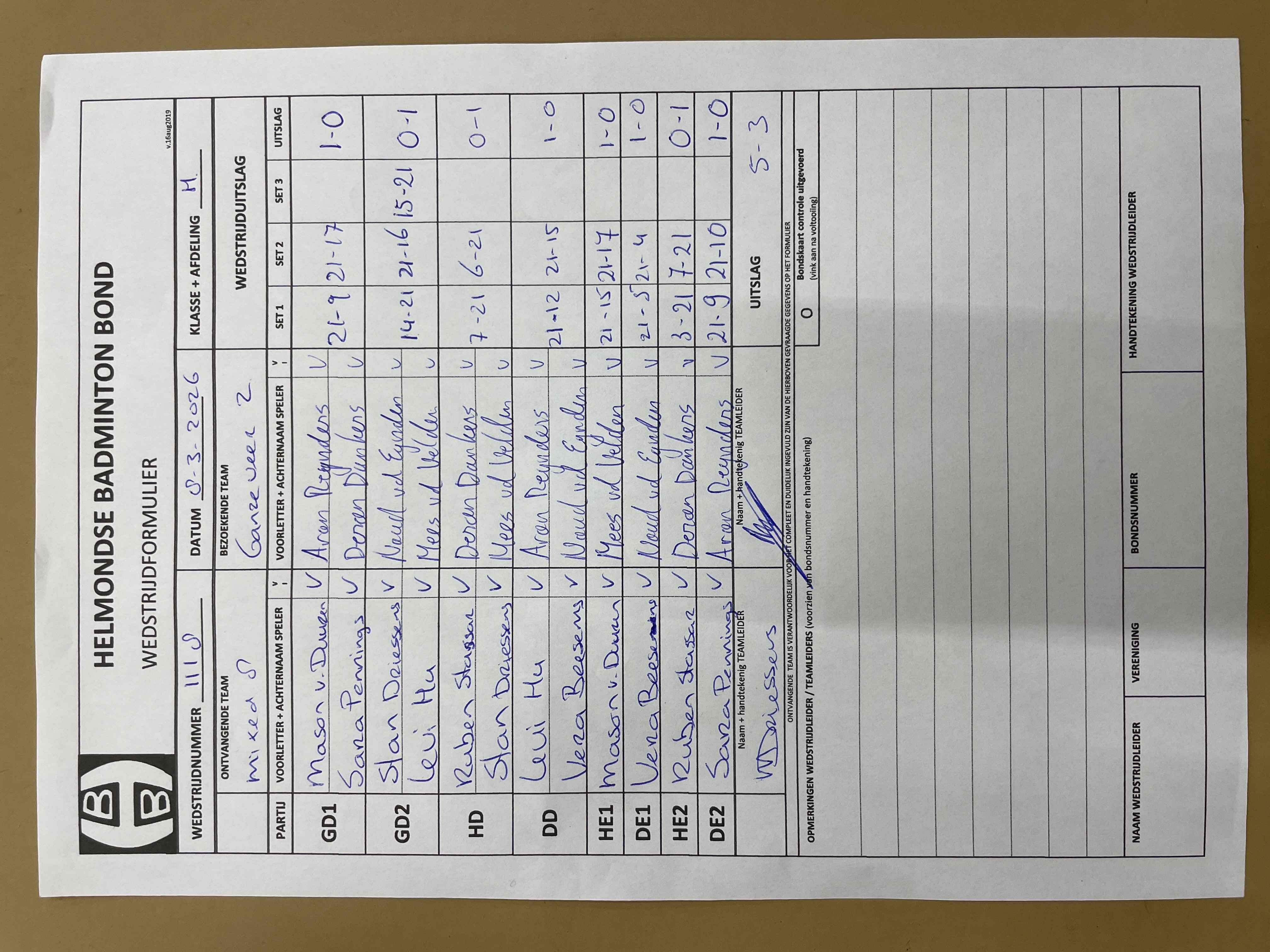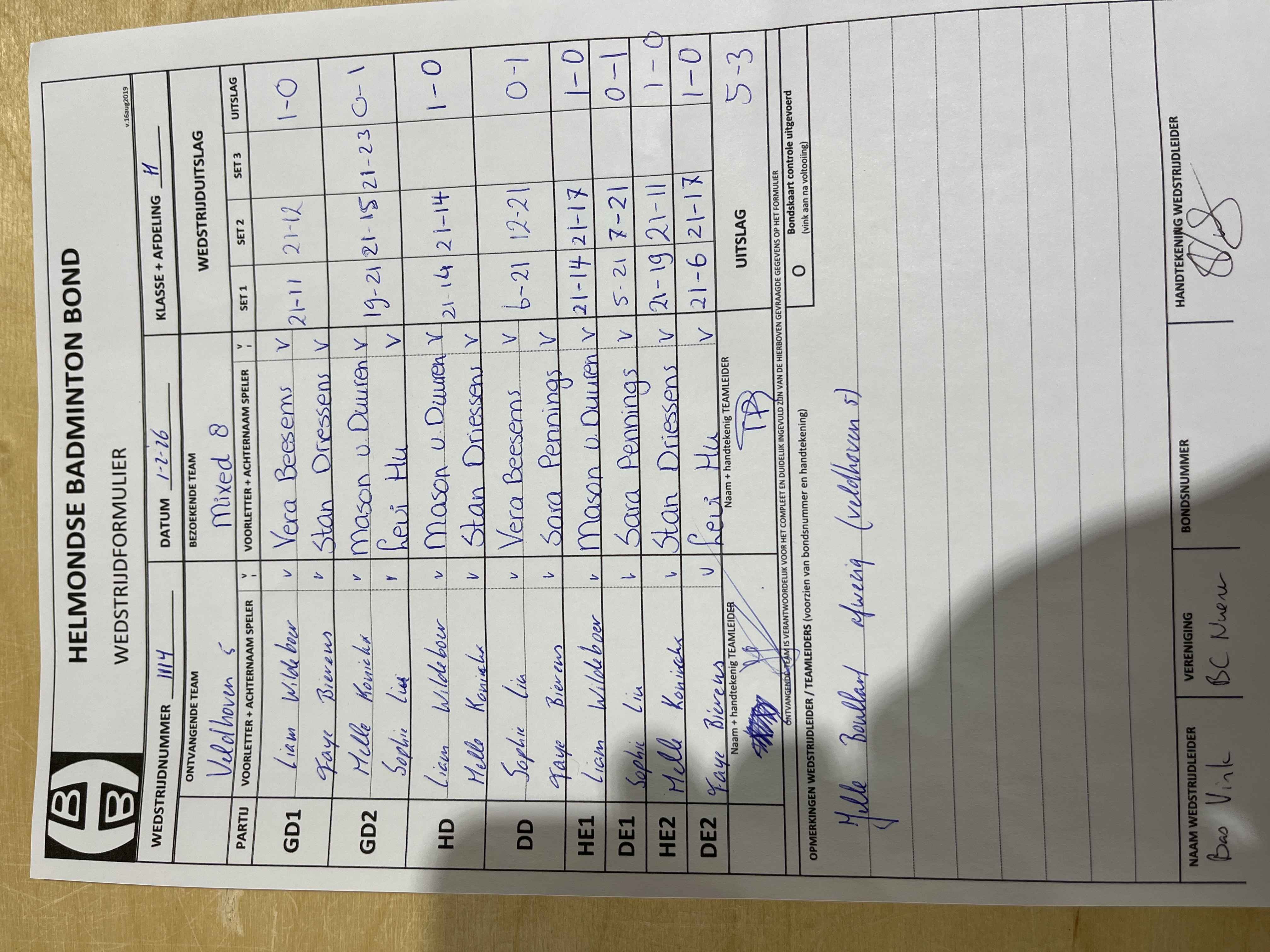 | 09:30 | zo 01-02-2026 | Veldhoven 5 | - | Mixed 8 | 13 | 5 - 3 | ||