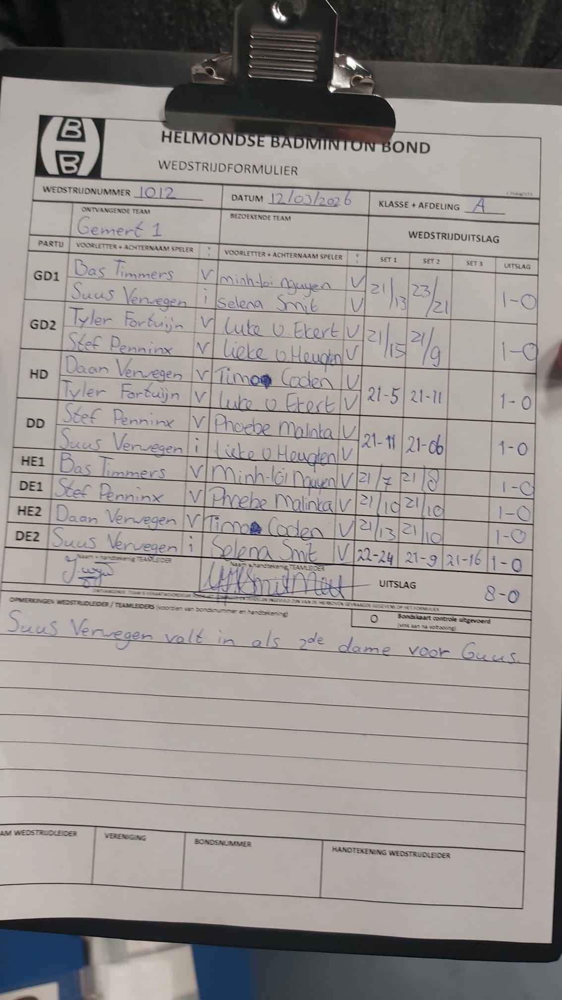 | 09:30 | zo 08-02-2026 | Gemert 1 | - | Phoenix 1 | 3 | 8 - 0 | ||