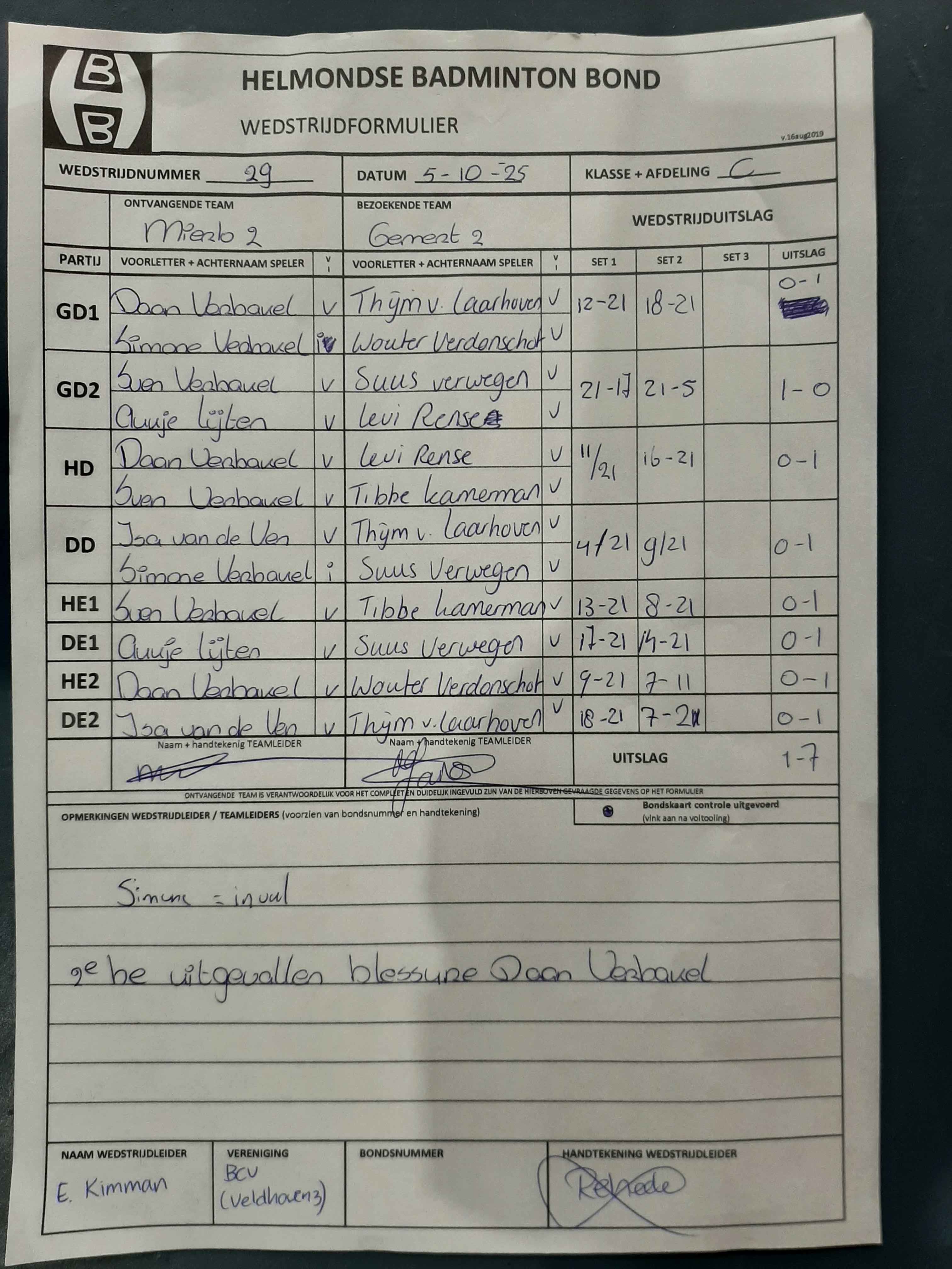 | 09:30 | zo 28-09-2025 | Mixed 3 | - | Gemert 2 | 2 | 3 - 5 | ||