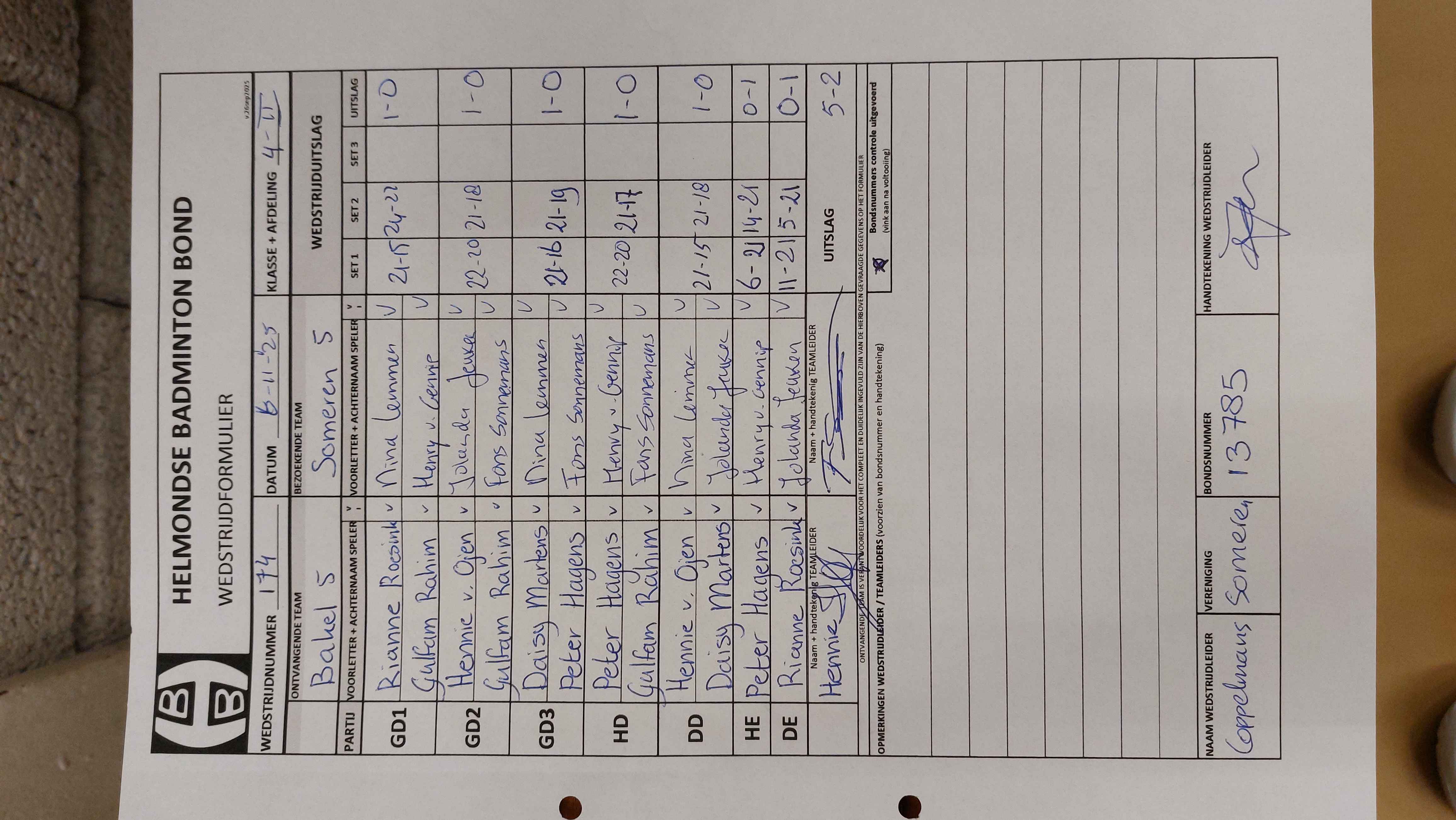 | 174 | do 06-11-2025 | Bakel 5 | - | Someren 5 | 13 | 5 - 2 | |||
