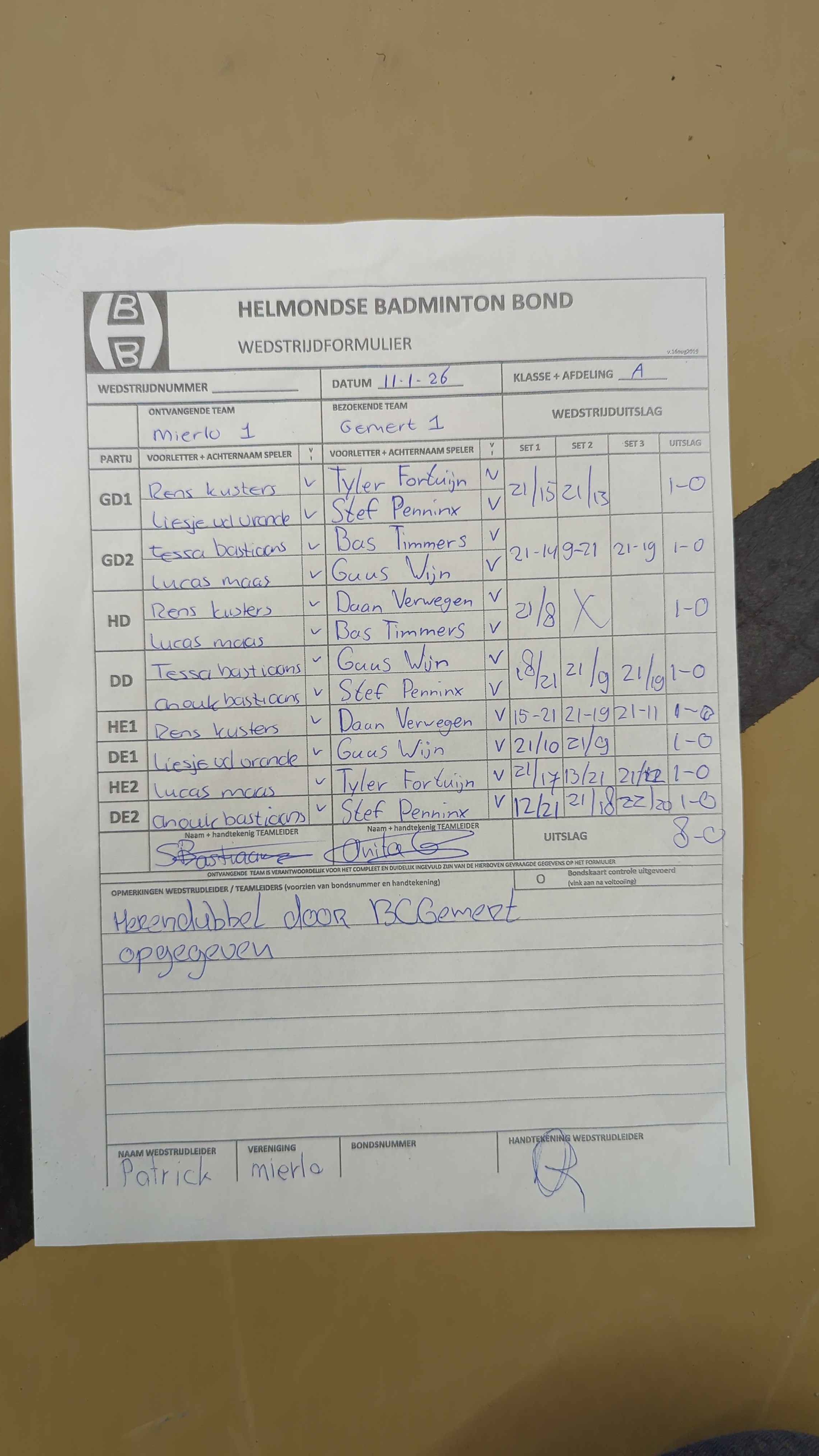 | 09:30 | zo 30-11-2025 | Mixed 2 | - | Mierlo 1 | 4 | 0 - 8 | ||