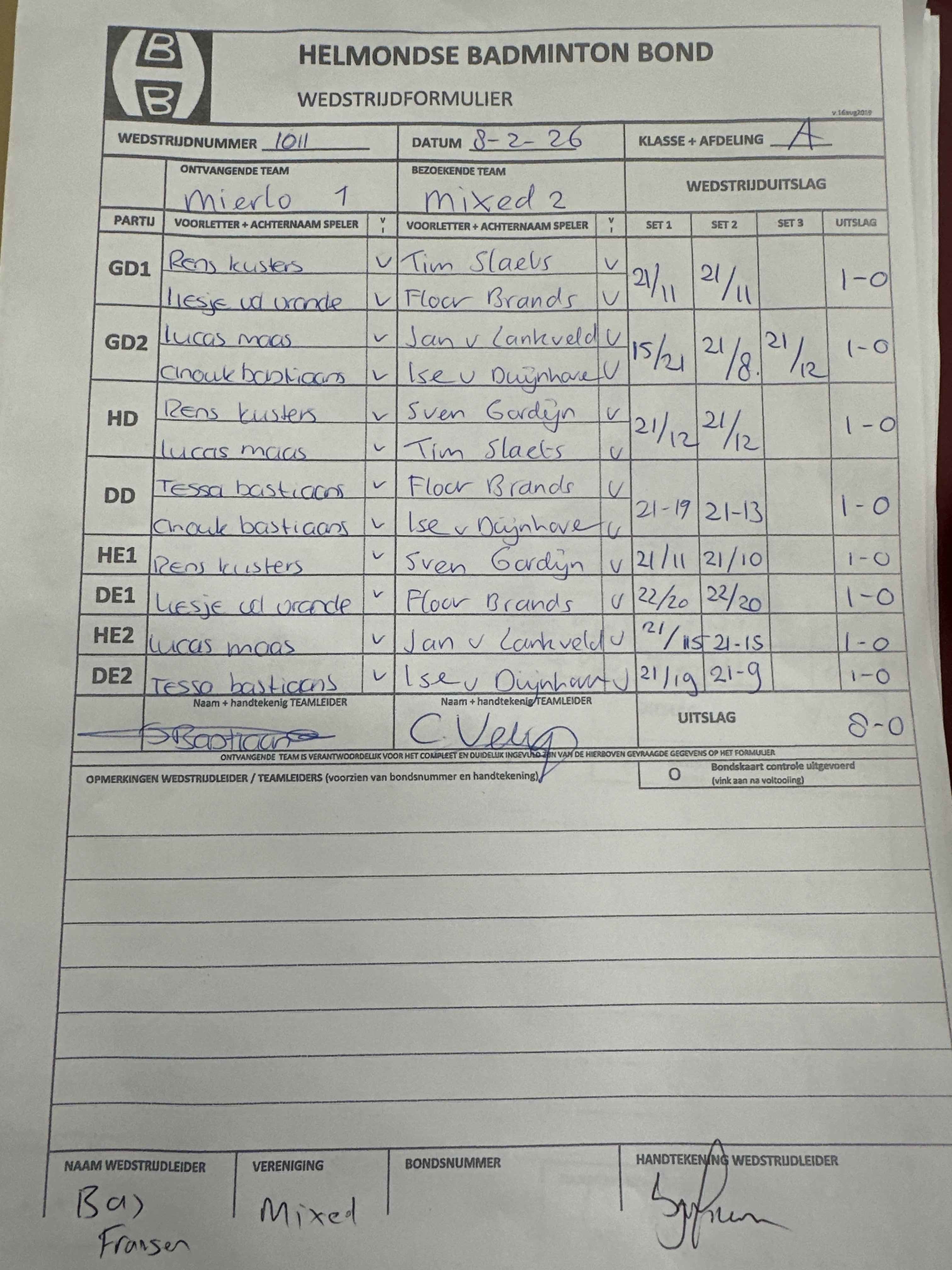 | 09:30 | zo 08-02-2026 | Mierlo 1 | - | Mixed 2 | 2 | 8 - 0 | ||