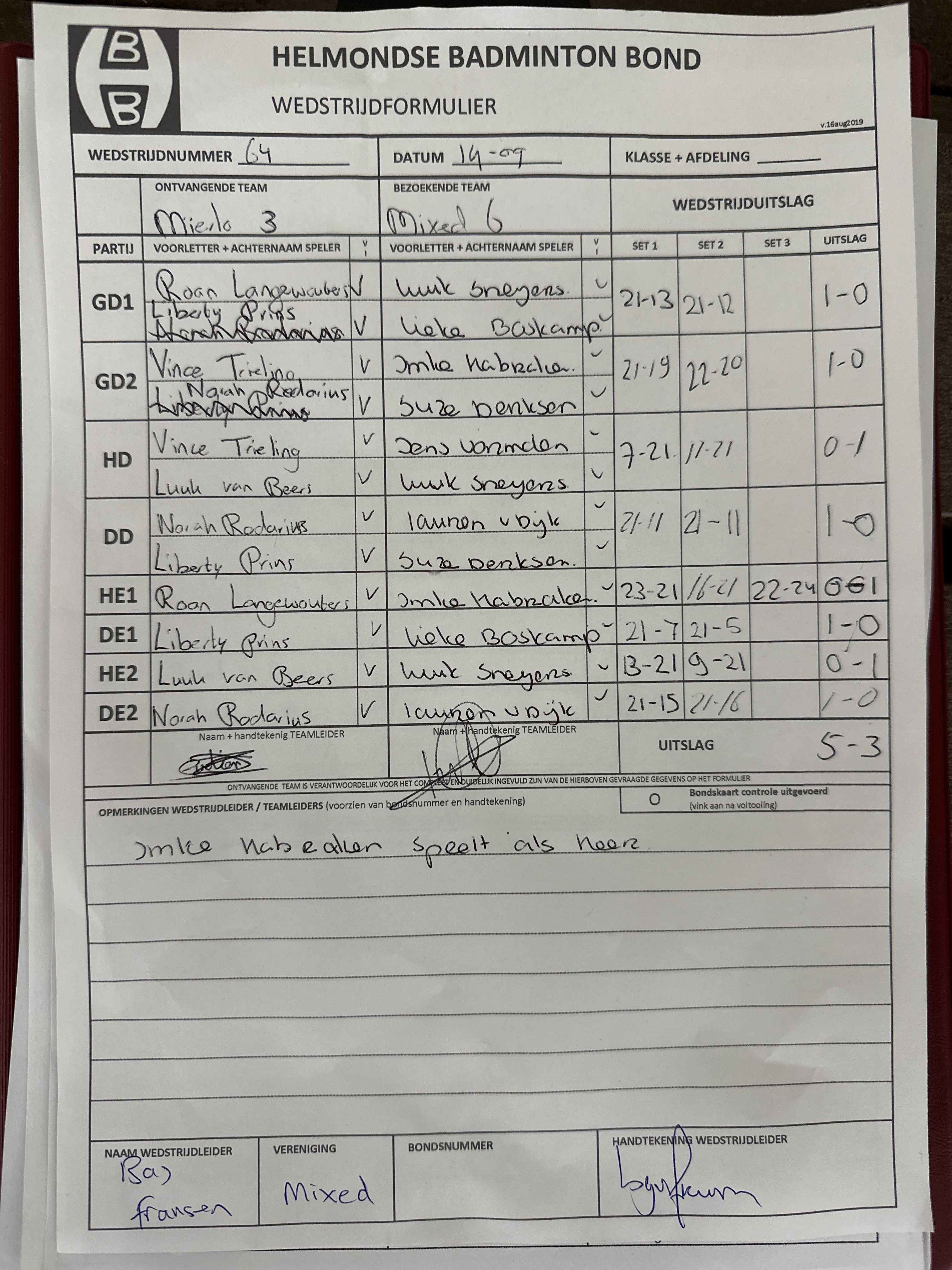 | 09:30 | zo 14-09-2025 | Mierlo 3 | - | Mixed 6 | 11 | 5 - 3 | ||