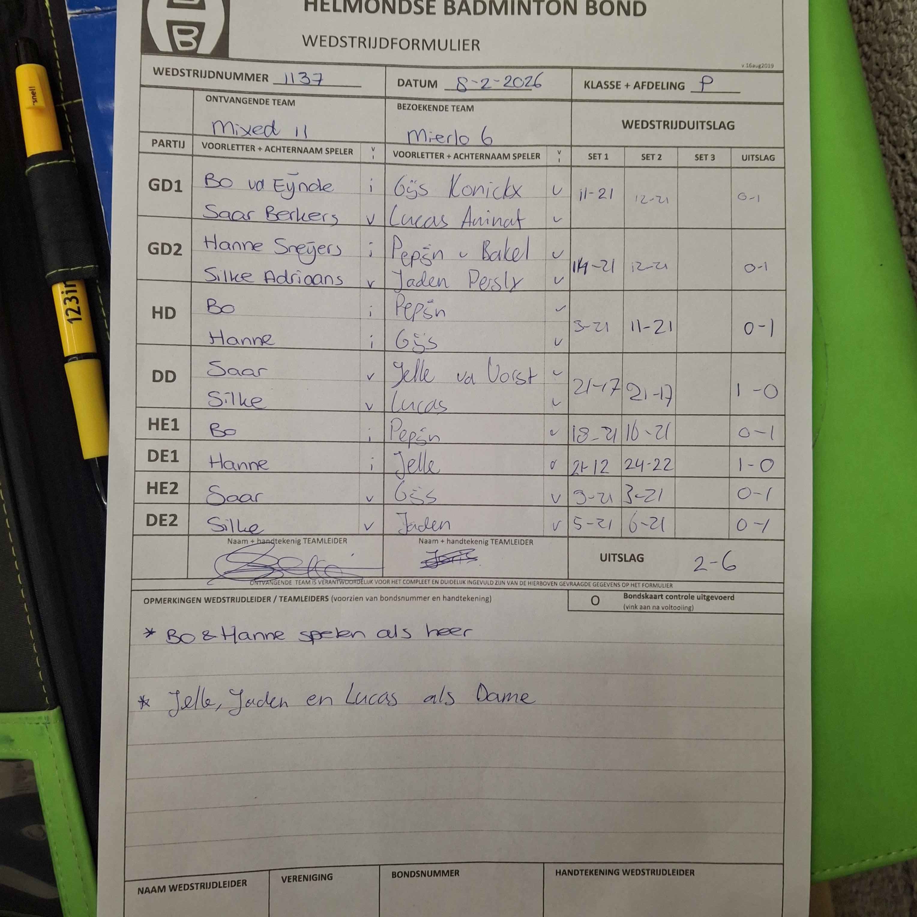 | 09:30 | zo 08-02-2026 | Mixed 11 | - | Mierlo 6 | 10 | 2 - 6 | ||