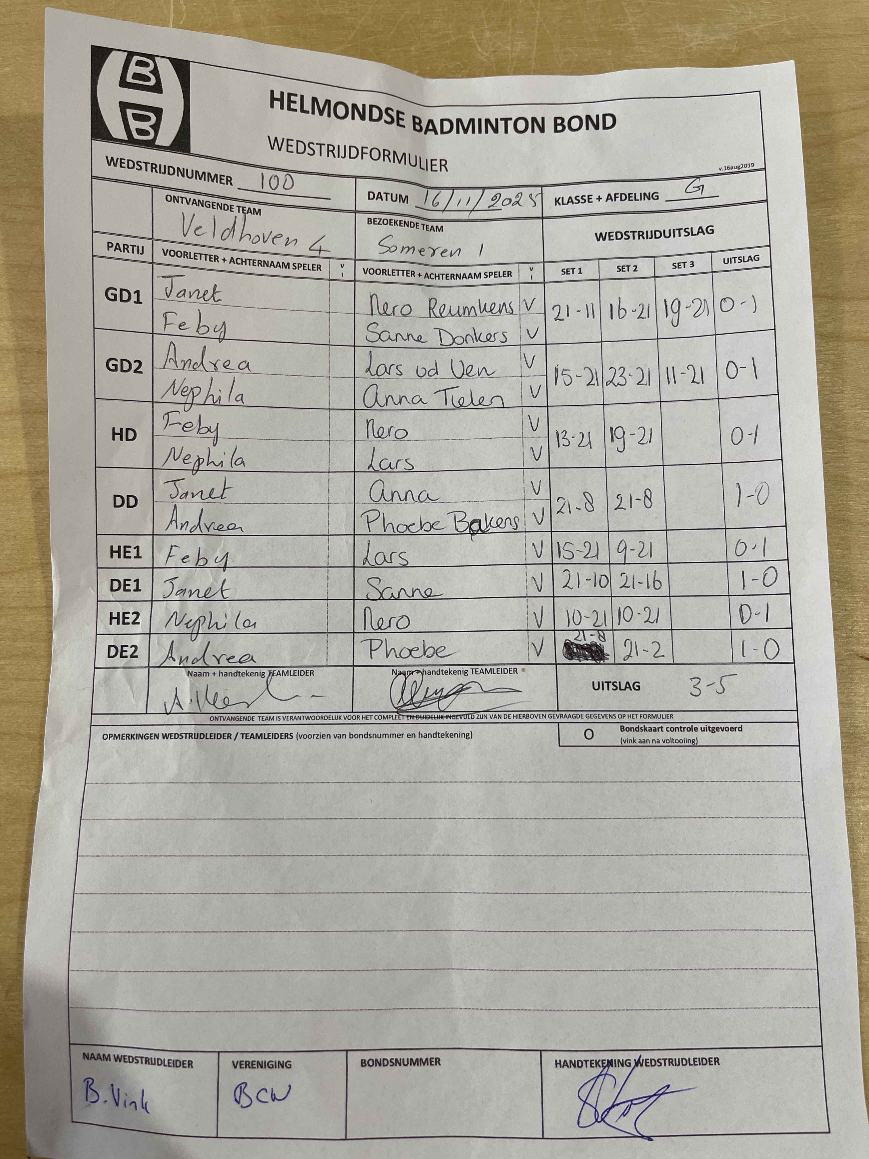 | 12:30 | zo 16-11-2025 | Veldhoven 4 | - | Someren 1 | 12 | 3 - 5 | ||