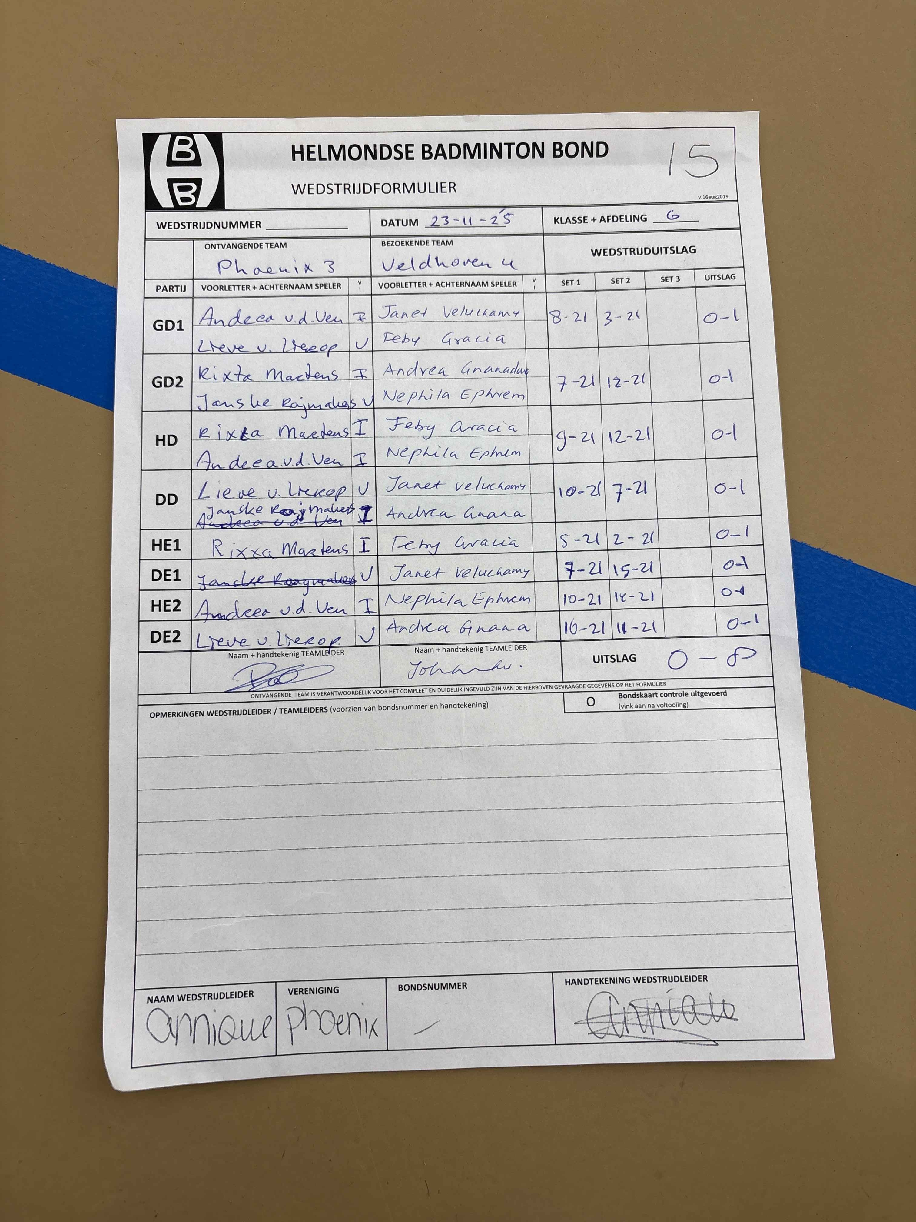 | 09:30 | zo 23-11-2025 | Phoenix 3 | - | Veldhoven 4 | 15 | 0 - 8 | ||